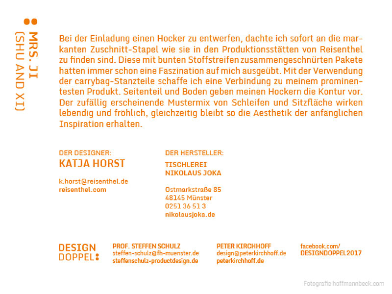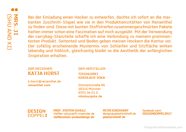 Das Projekt DESIGNDOPPEL:2017 wurde von den Produktdesignern Peter Kirchhoff und Prof. Steffen Schulz initiiert. Am Beispiel eines Hockers lässt das Projekt Produktdesign und Handwerk erlebbar werden. Produktdesigner und Handwerksbetriebe aus der Region entwickelten gemeinsam spektakuläre, unterhaltsame Hocker, die das breite Spektrum des Produktdesigns visualisieren.